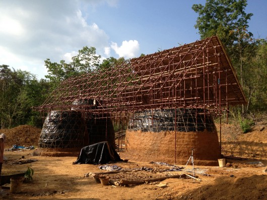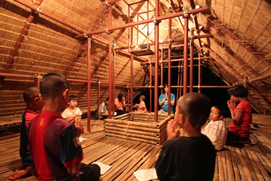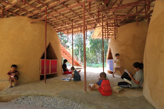 The round volumes create a warm interior, fostering a sense of comfort for the children in prayer dome and classroom of earth. The floating level above functions as a buddhist room and learning area. A gentle breeze flows through the thatched roof, giving the feeling of being in a ship. The upper floor connects to the lower earthbag domes through two openings.