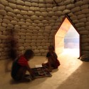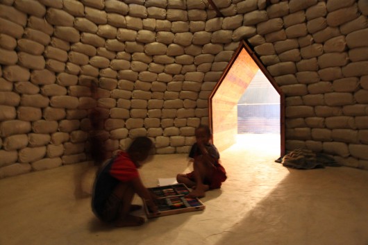Wanting to provide a good future for these kids, we hoped that the school would be designed as the realization of their dreams. So, at first the teacher asked the children to draw the dream of the school building. One of them drew a flying ship. We adapted his idea, and translated his drawing into the architectural design. The image was adapted into two main architectural components: the round, earthbag volumes on the ground and the other, a light steel structure finished with bamboo and a grass roof.