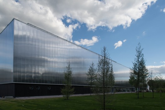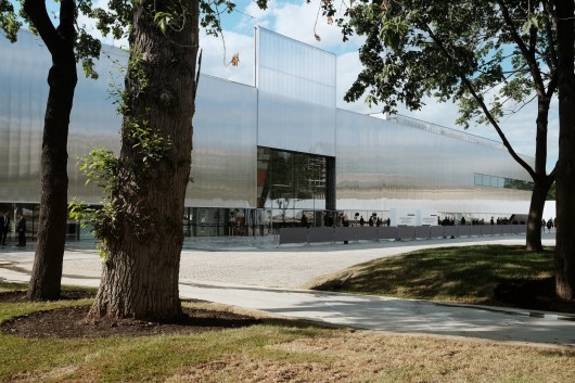 The entrance to Garage Gorky Park is marked by two large facade panels that slide upwards to frame the art in the lobby’s double height space and provide a view through the building from the park.