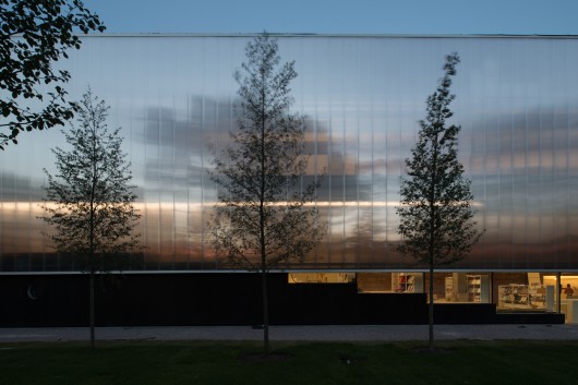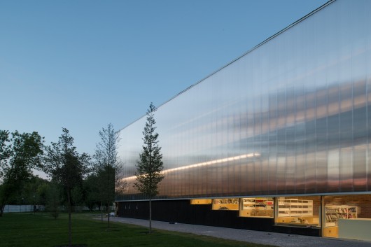 The existing concrete structure is enclosed with a new translucent double layer polycarbonate façade that will accommodate a large portion of the building’s ventilation equipment, allowing the exhibition spaces to remain free. The facade is lifted 2.25 metres from the ground in order to visually reconnect the pavilion’s interior to the park.