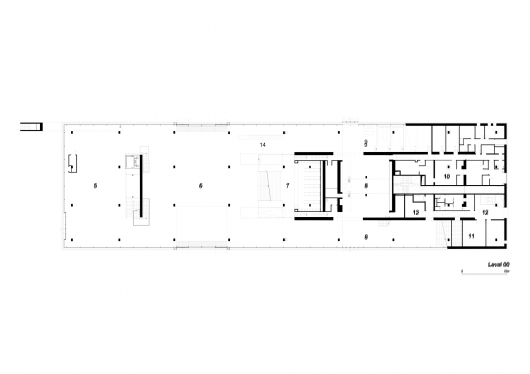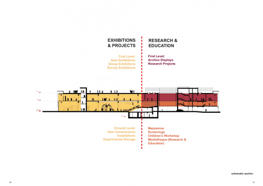 The building offers two levels of unobstructed open space that will be dedicated to exhibitions, organized around two circulation and service cores. museum programs occupy three levels, adapting to spatial and structural possibilities of the existing structure. The more fragmented spaces in the North Eastern part of the pavilion surrounding the main core primarily accommodate education and research programs. The large open spaces in the South Western part are dedicated to exhibitions, projects and events.