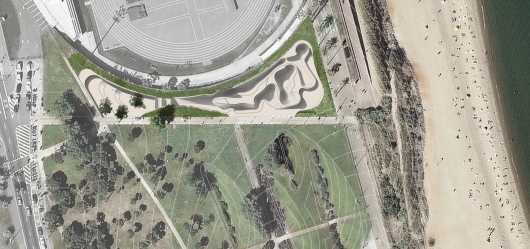 The skatepark is planned as a new artificial topography, as a game of dunes that are adapted to the ground and take advantage of the different ground levels that are created in the direction of the sea, following the intervention strategy of the Park of Poble Nou.